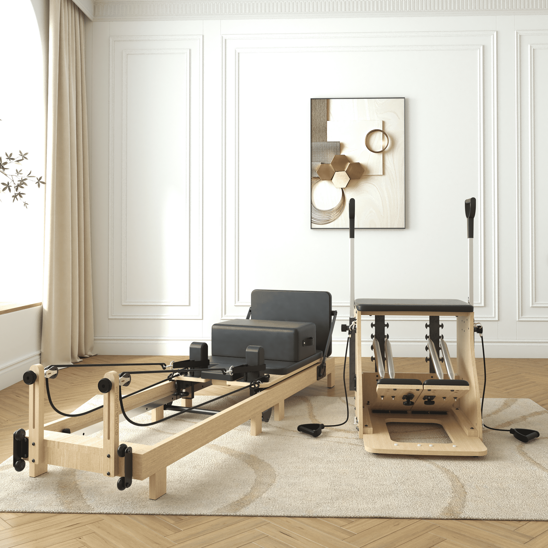 Combining the comprehensive training system of the Pilates reformer and Pilates chair, we present to you a new home fitness solution. This combination not only strengthens core muscles and enhances stability but also precisely exercises all muscle groups through diversified training movements, improving balance and flexibility, making every workout efficient and enjoyable.